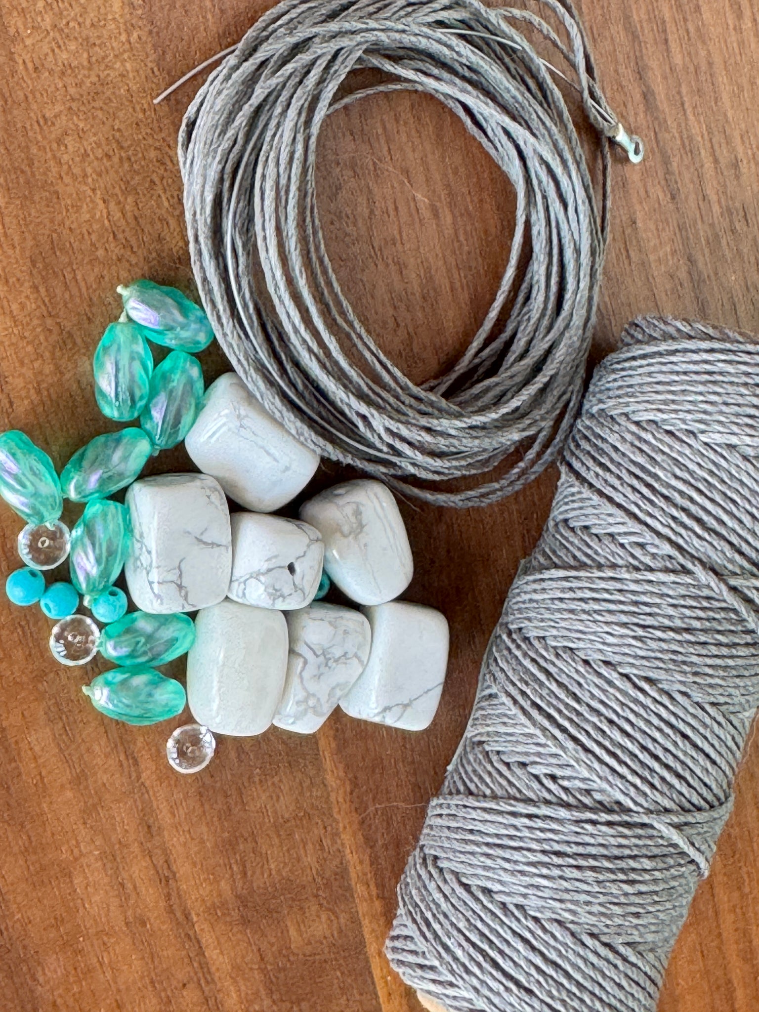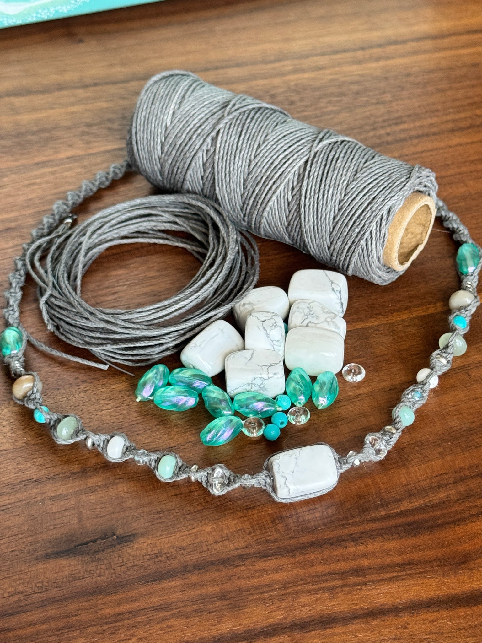 Change doesn't have to be chaotic, sometimes its a steady unfolding into peace. Handwoven with soft grey hemp, this necklace blends with howlite for cal and awareness, green aventurine for new beginnings, clear quarts to amplify growth and amazonite to open the heart with courage and truth.